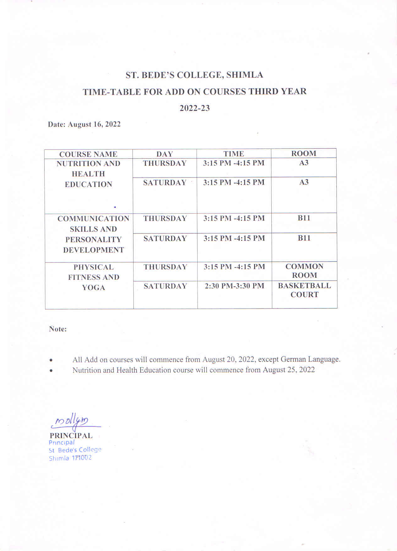 German Nutrition and Health Education Physical Fitness and Yoga Self Defence/First Aid/Fire Fighting |