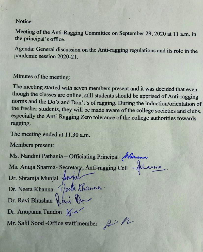 The college has an Anti-Ragging cum Grievances and Redressal cell with the following rules and regulations under the Supreme Court of India Orders. Ragging is a criminal conspiracy, unlawful assembly and rioting, public nuisance, violation of decency and morals through ragging, injury to body, causing hurt or grievous hurt, wrongful restraint, wrongful confinement, use of criminal force, assault as well as sexual offences or even unnatural offences, extortion, criminal trespass, criminal intimidation and attempt to commit any or all of the above mentioned offences against the victim is considered to be ragging.