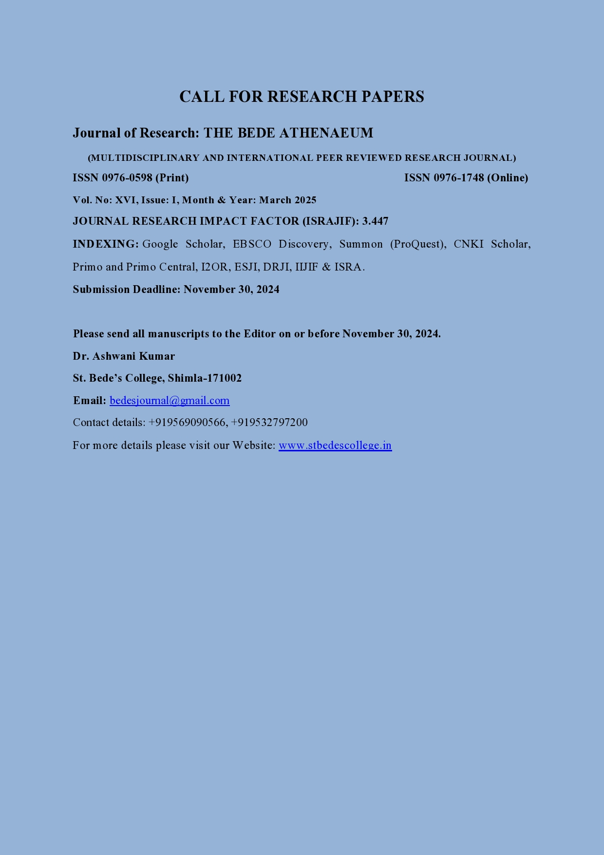 The Bede Athenaeum is an official publication of St. Bede’s Educational Society, Shimla, India. This multidisciplinary international peer-reviewed journal aims at promoting and publishing new concepts, knowledge and ideas from the languages, arts, social sciences applied sciences and education, thereby providing scholars a vibrant forum for sharing their research and perspectives with the academic fraternity from across India and abroad.